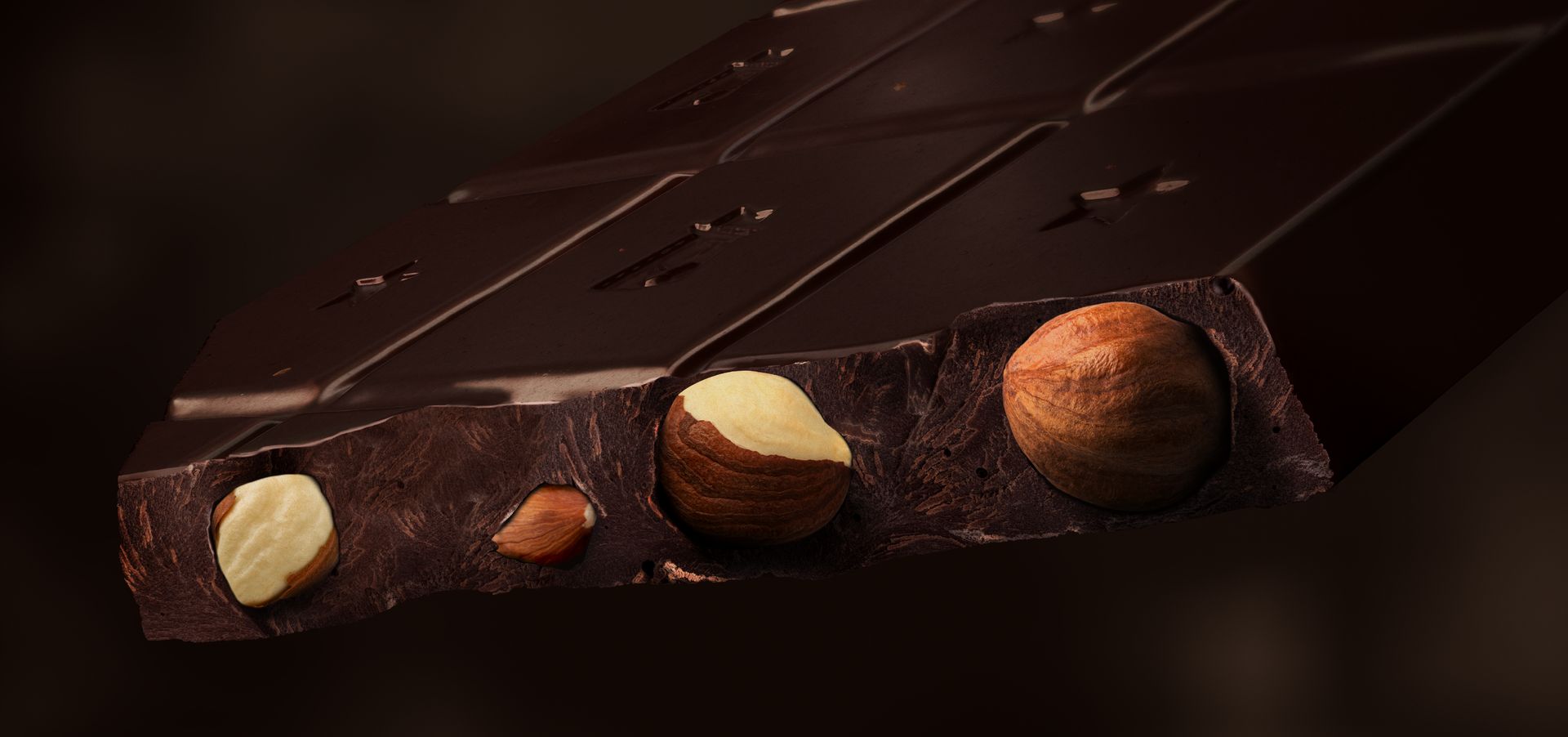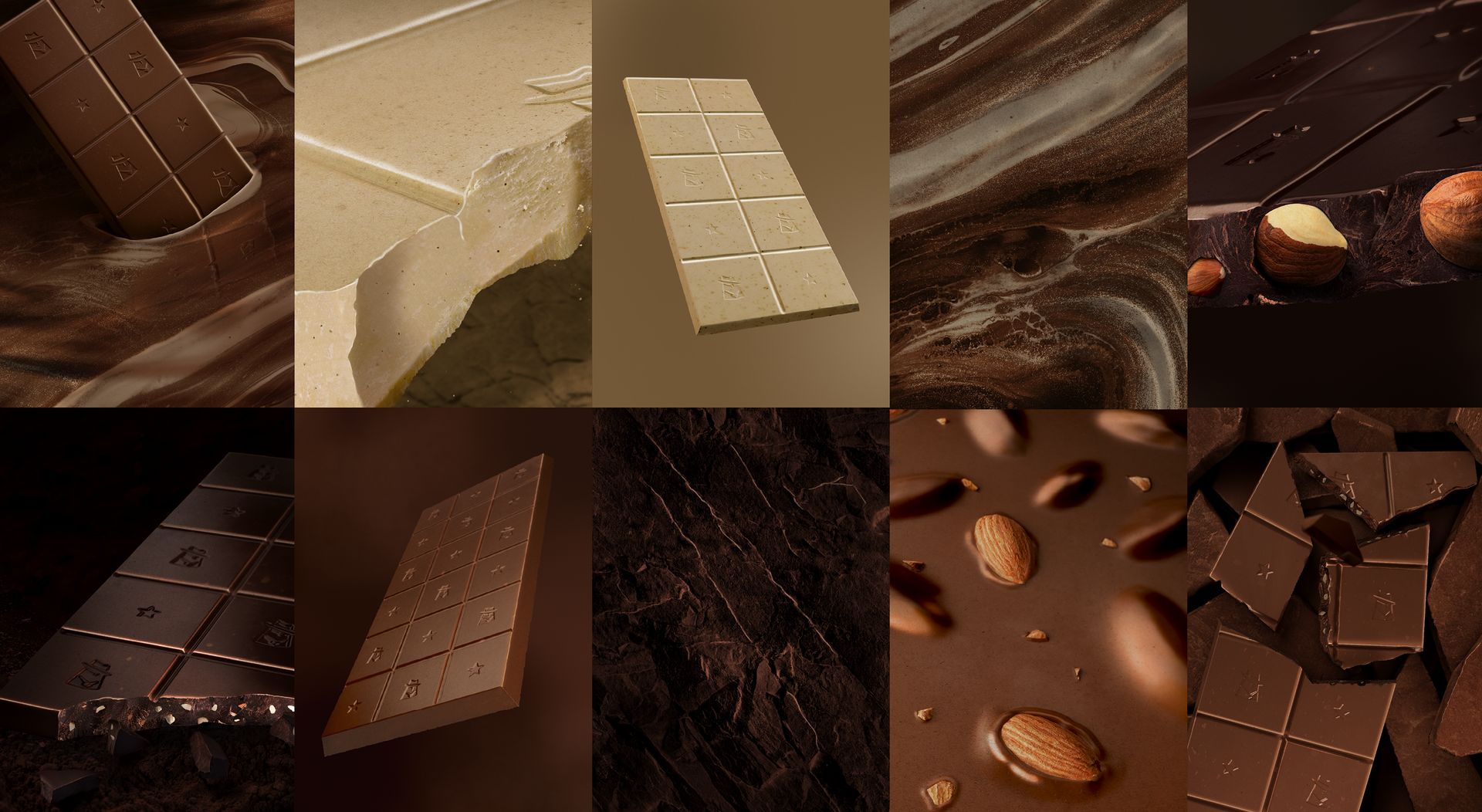 Inspirados por esa misma idea, construimos una estética que evocaba la creación del universo, pero en chocolate. Un big bang tentador, elegante, suspendido en un cosmos propio. Nos metimos en un proceso larguísimo de bocetado, modelado 3D, render y retoque final, antes de que existieran las inteligencias artificiales. Un mes entero de trabajo artesanal para lograr doce imágenes que podían irrumpir con elegancia en vía pública, kioscos y redes. Avellanas explotando y almendras sobresaliendo sutilmente del chocolate. Un lenguaje visual completamente alejado del universo tradicional de la publicidad de snack de kiosco.